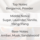 - Middle Notes: Sugar, Lavender, Vanilla, Ylang-Ylang